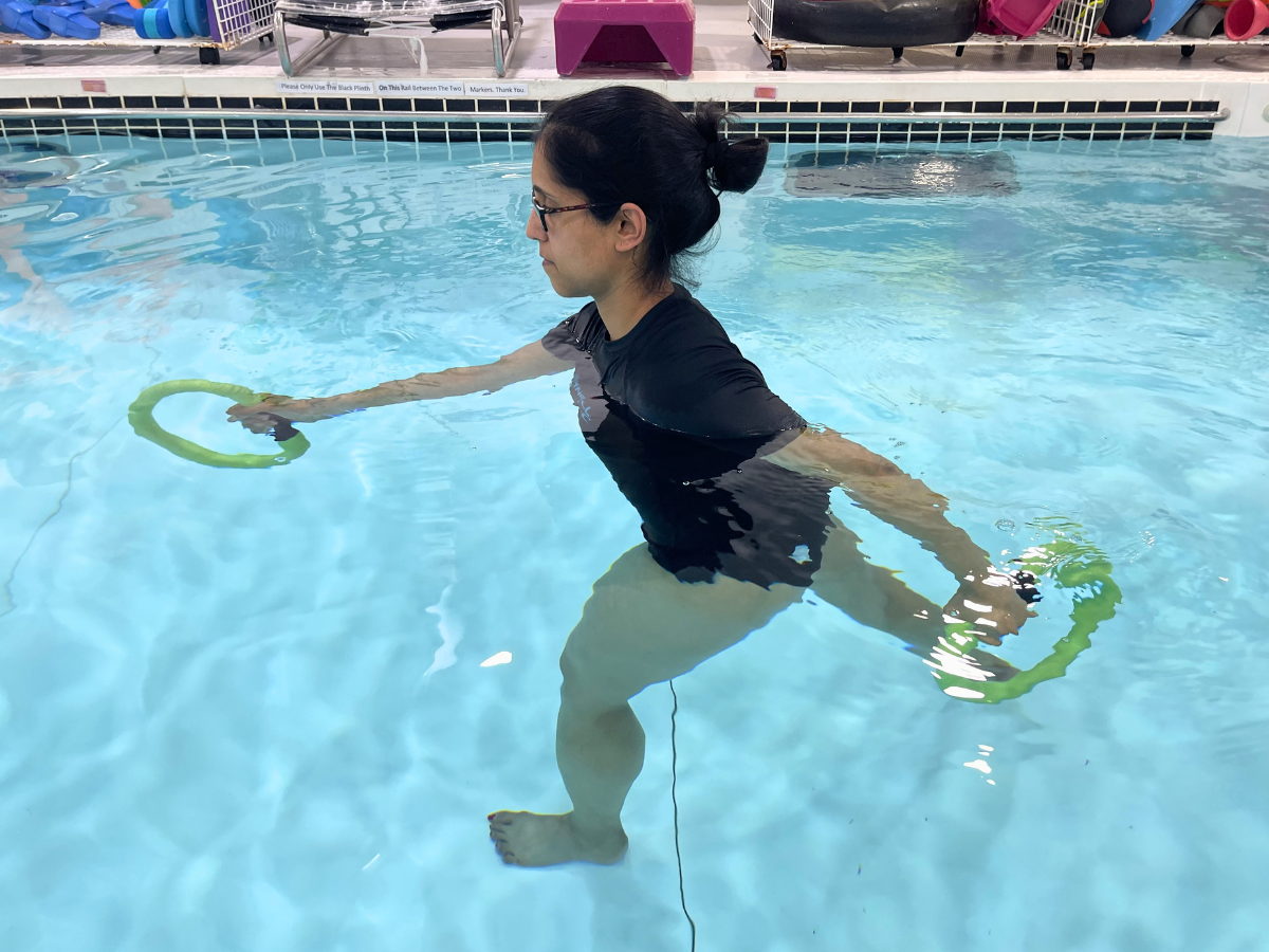 Below is a progression of exercises we commonly use in the pool to help restore shoulder flexion.